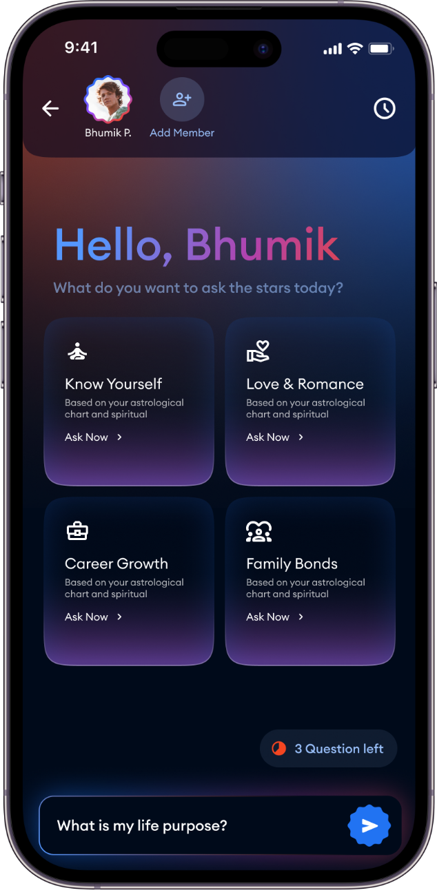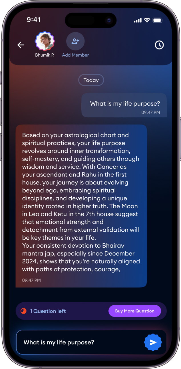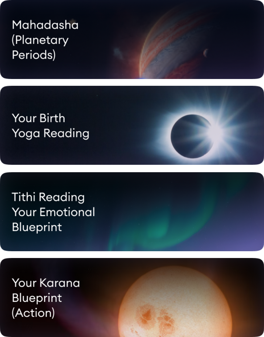 Get personalized interpretations of your birth chart, Understand planetary positions and their influence on you, Explore key life phases through ancient Vedic wisdom, All decoded with the precision and power of AI.
