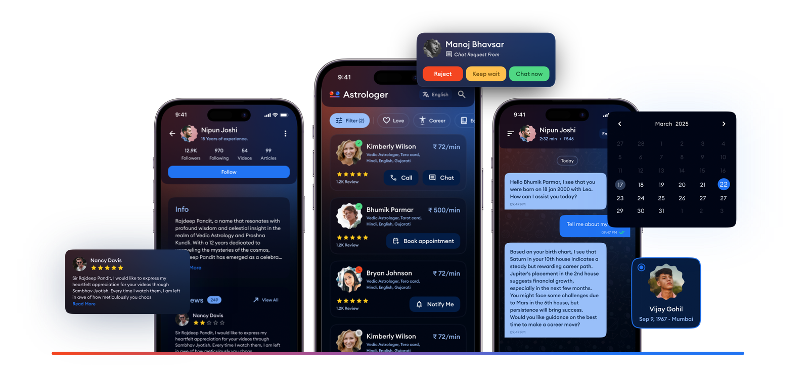 From daily doubts to life-changing decisions — get real-time guidance from certified experts. Chat, call, or book appointments with trusted astrologers anytime, right from the app. Vedic wisdom, delivered personally to you — just a tap away.